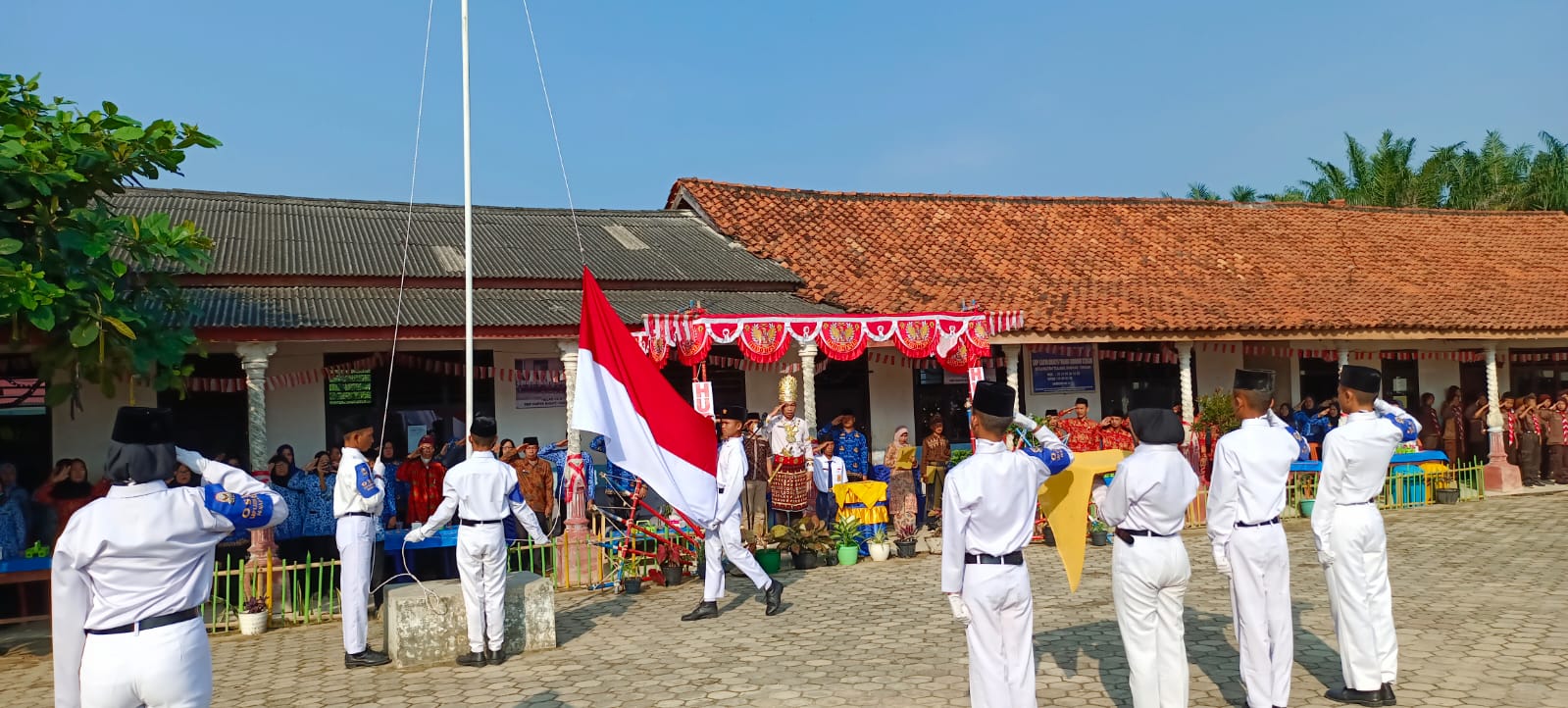 TULANGBAWANG BARAT-Yayasan Pendidikan SMP Karya Bhakti Panaragan bersama Pemerintah Tiyuh Panaragan Kecamatan Tulang Bawang Tengah (TBT), Kabupaten Tulang Bawang Barat (Tubaba) melaksanakan upacara pengibaran bendera merah putih di halaman SMP Karya Bhakti.