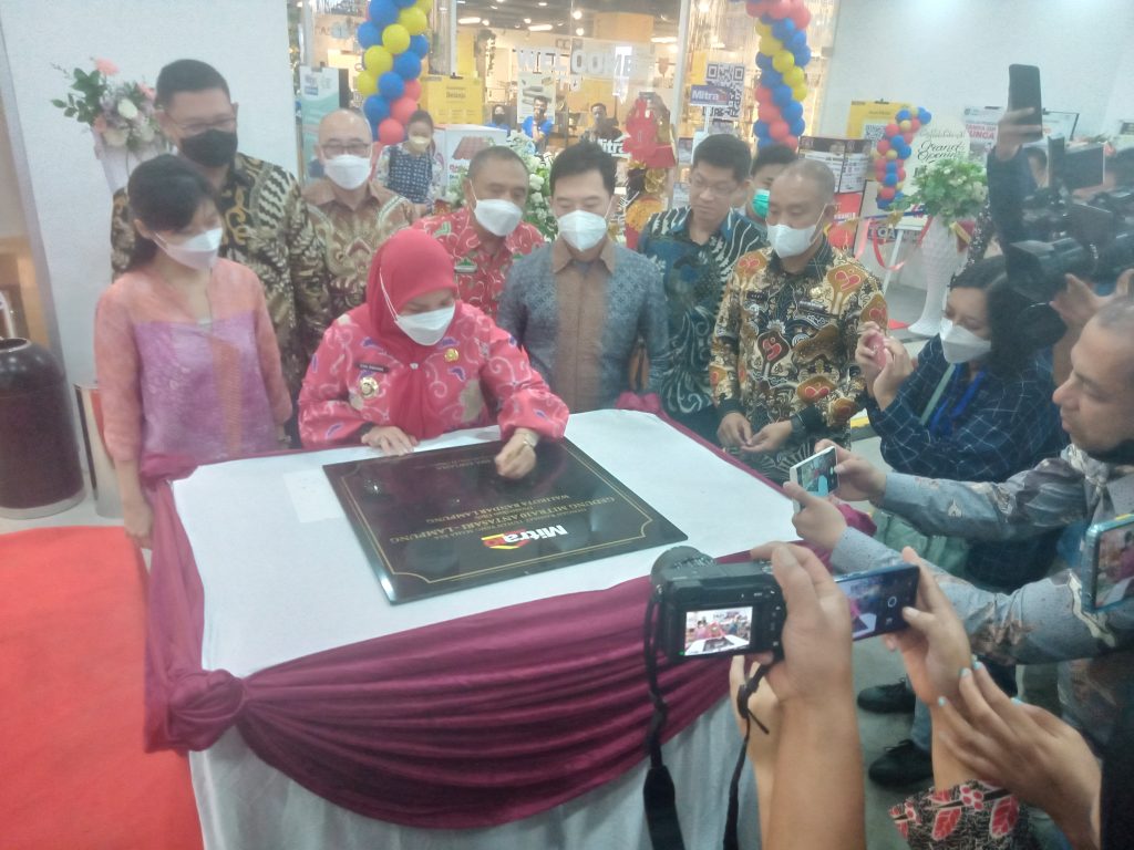 Walikota Bandar Lampung, Eva Dwiana saat melakukan penandatanganan prasasti peresmian Mitra10 Antasari Supermarket Bahan Bangunan dan Perlengkapan Rumah, Kamis (27/10/2022). (foto: budi)