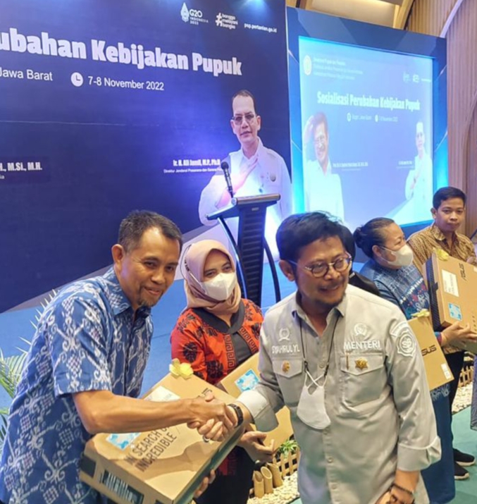 Penghargaan tersebut, diserahkan langsung oleh Menteri Pertanian (Mentan) RI, Syahrul Yasin Limpo kepada Pelaksana Tugas (Plt) Kabid PSP Dinas Ketahanan Pangan Tanaman Pangan dan Hortikultura (DKPTPH) Lampung, Tubagus M Rifki pada acara sosialisasi perubahan kebijakan pupuk, di Hotel Bigland Kota Bogor, Provinsi Jawa Barat (Jabar), Senin (07/11/2022).