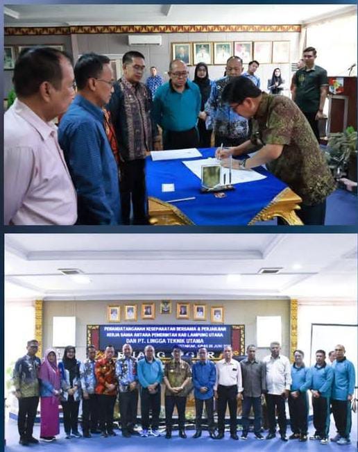 LAMPUNG UTARA – Bupati Lampung Utara, Hamartoni Ahadis melakukan penandatanganan kesepakatan bersama dan perjanjian kerja sama antara Pemerintah Daerah Kabupaten Lampung Utara dengan PT. Lingga Tekhnik Utama, Kamis (05/06/2025)