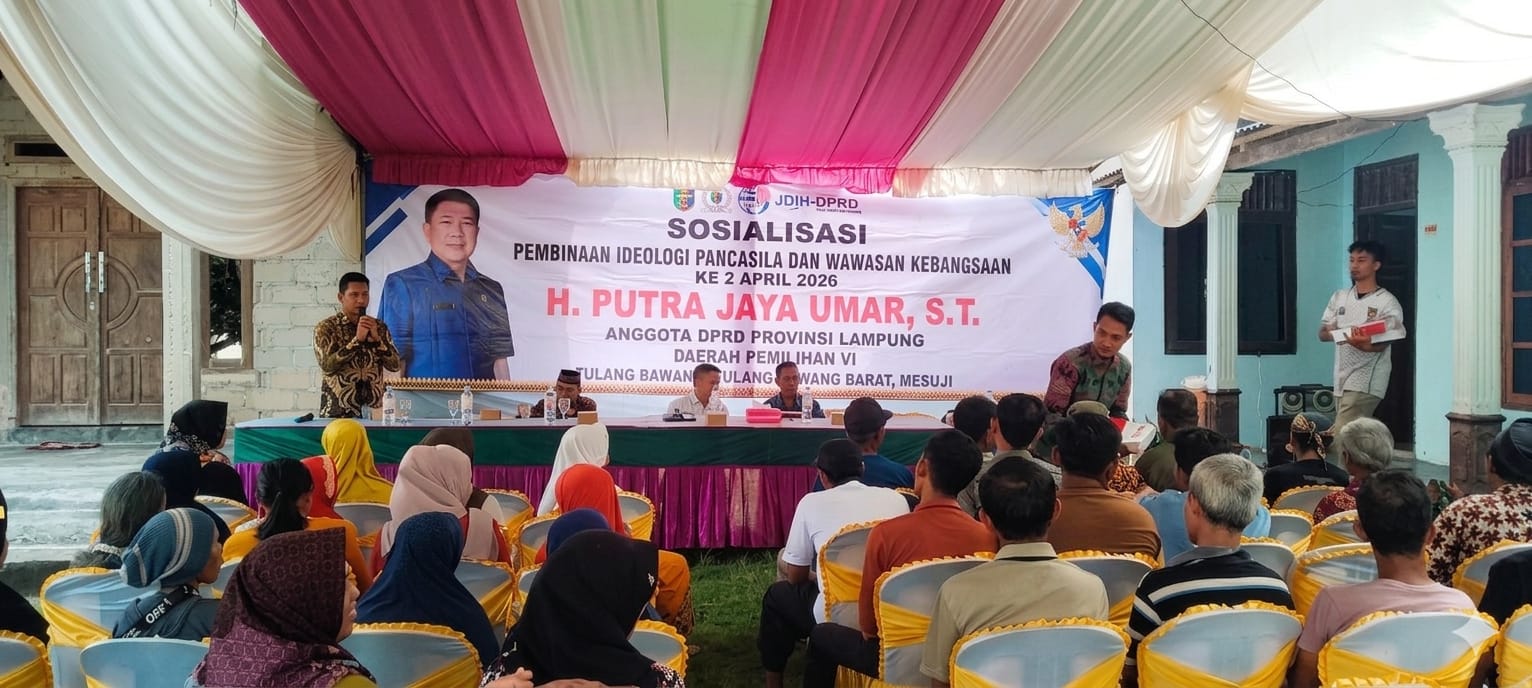 TULANGBAWANG BARAT— Anggota DPRD Provinsi Lampung, Putra Jaya Umar, menekankan pentingnya penguatan pendidikan karakter anak berbasis nilai-nilai Pancasila dalam kegiatan sosialisasi Pembinaan Ideologi Pancasila dan Wawasan Kebangsaan di Tiyuh Tirta Makmur, Kecamatan Tulangbawang Tengah, Kabupaten Tulangbawang Barat, Minggu (26/4/2026).